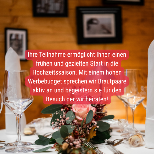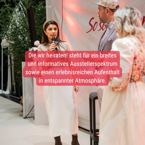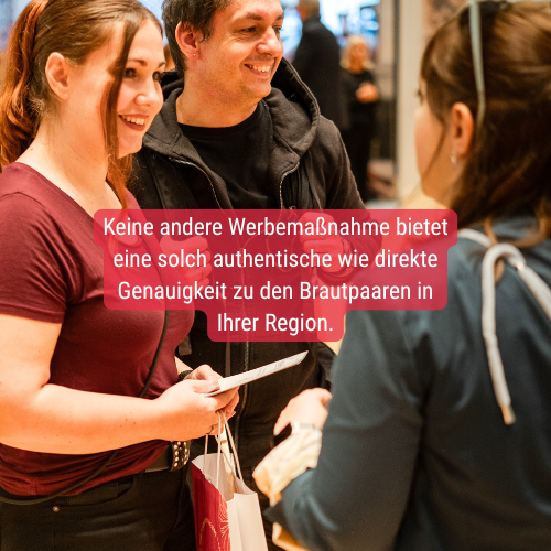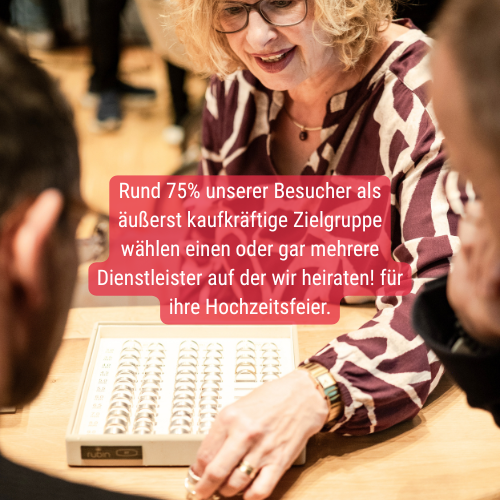 Die wir heiraten! erreicht Ihre Zielgruppe zu 100 % und spricht kaufkräftige Hochzeitspaare Ihrer Region frühzeitig und direkt an. Grundlage ist unser bewährtes Konzept mit vielfältigen Ausstellern und einem erlebnisreichen Rahmenprogramm in entspannter Atmosphäre.